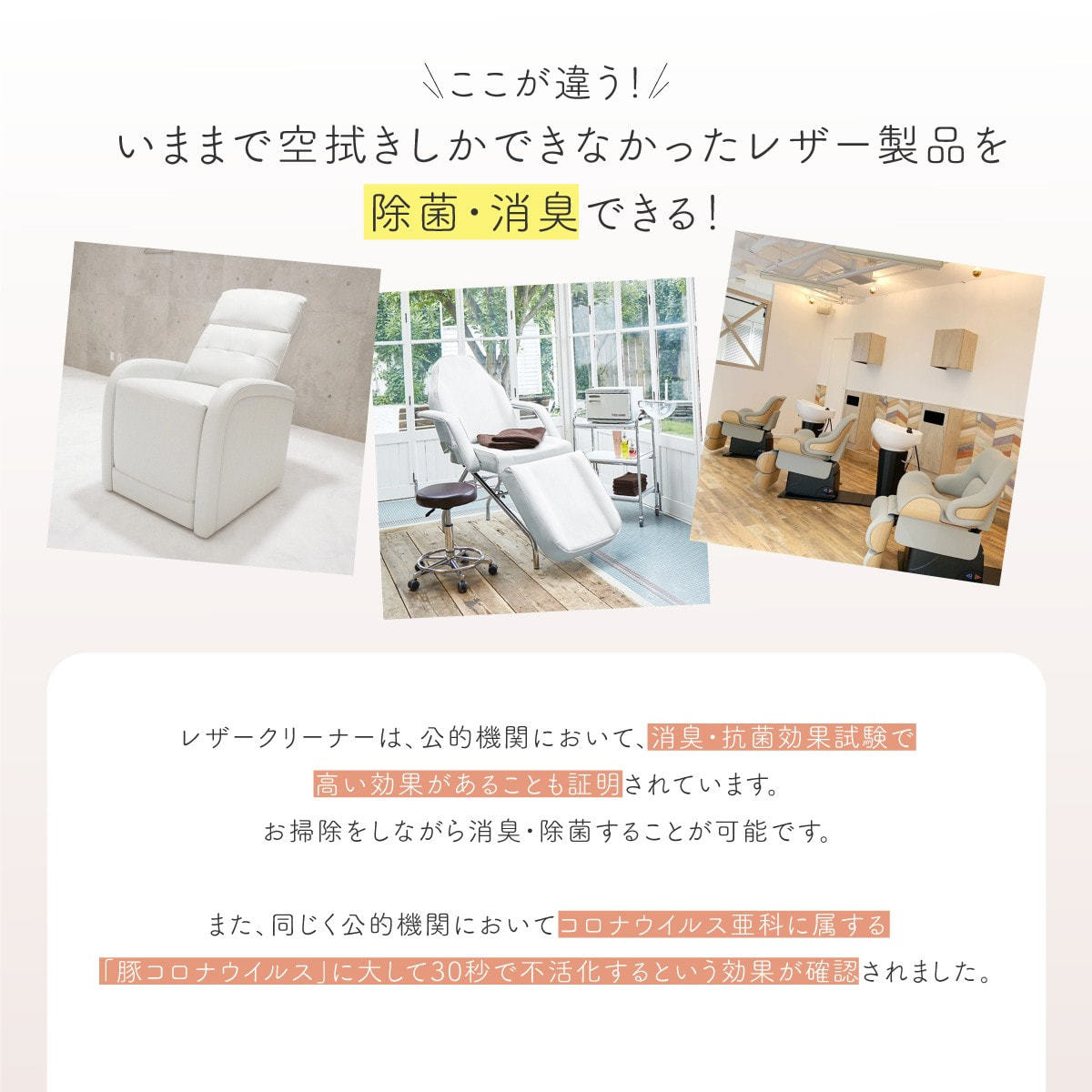 レザー・PUレザー製の素材に対応し、 レザーの色落ち試験をクリアしているため、安心して日常清掃・除菌・消臭にご使用いただけます。